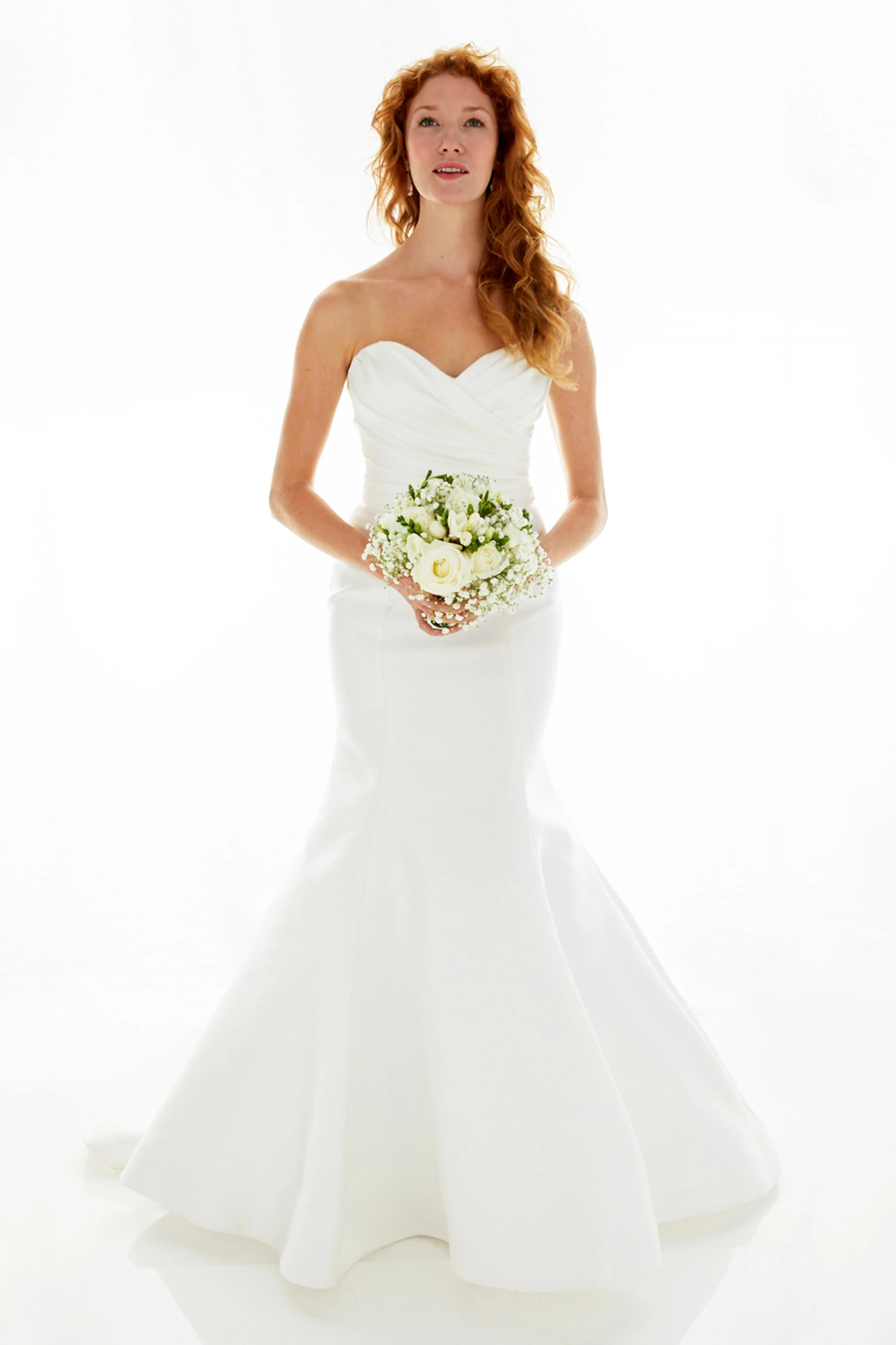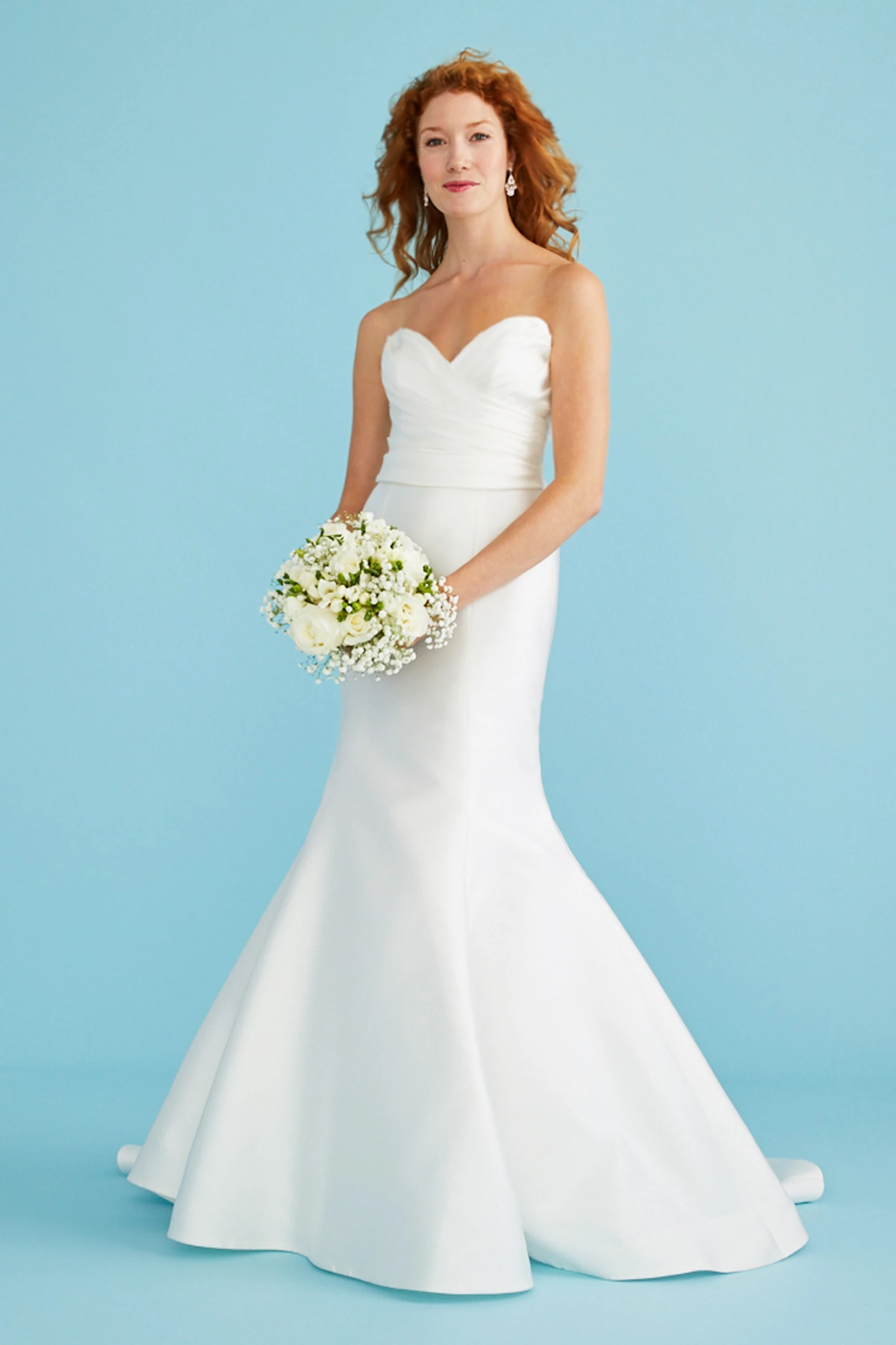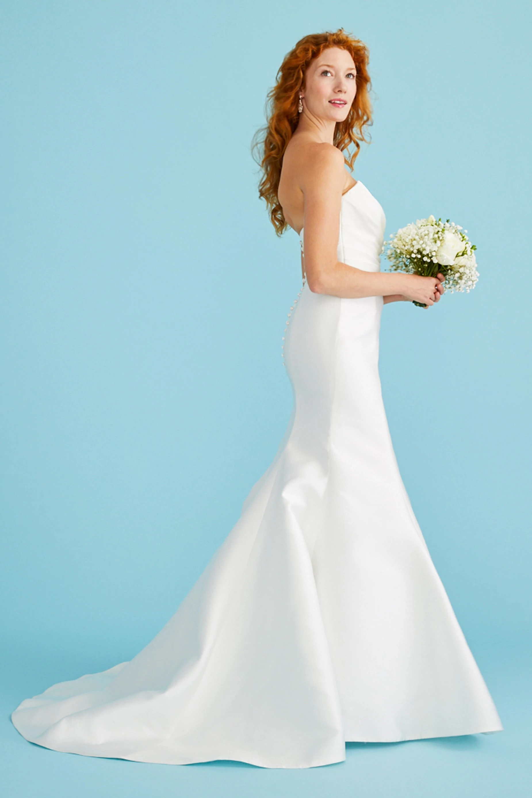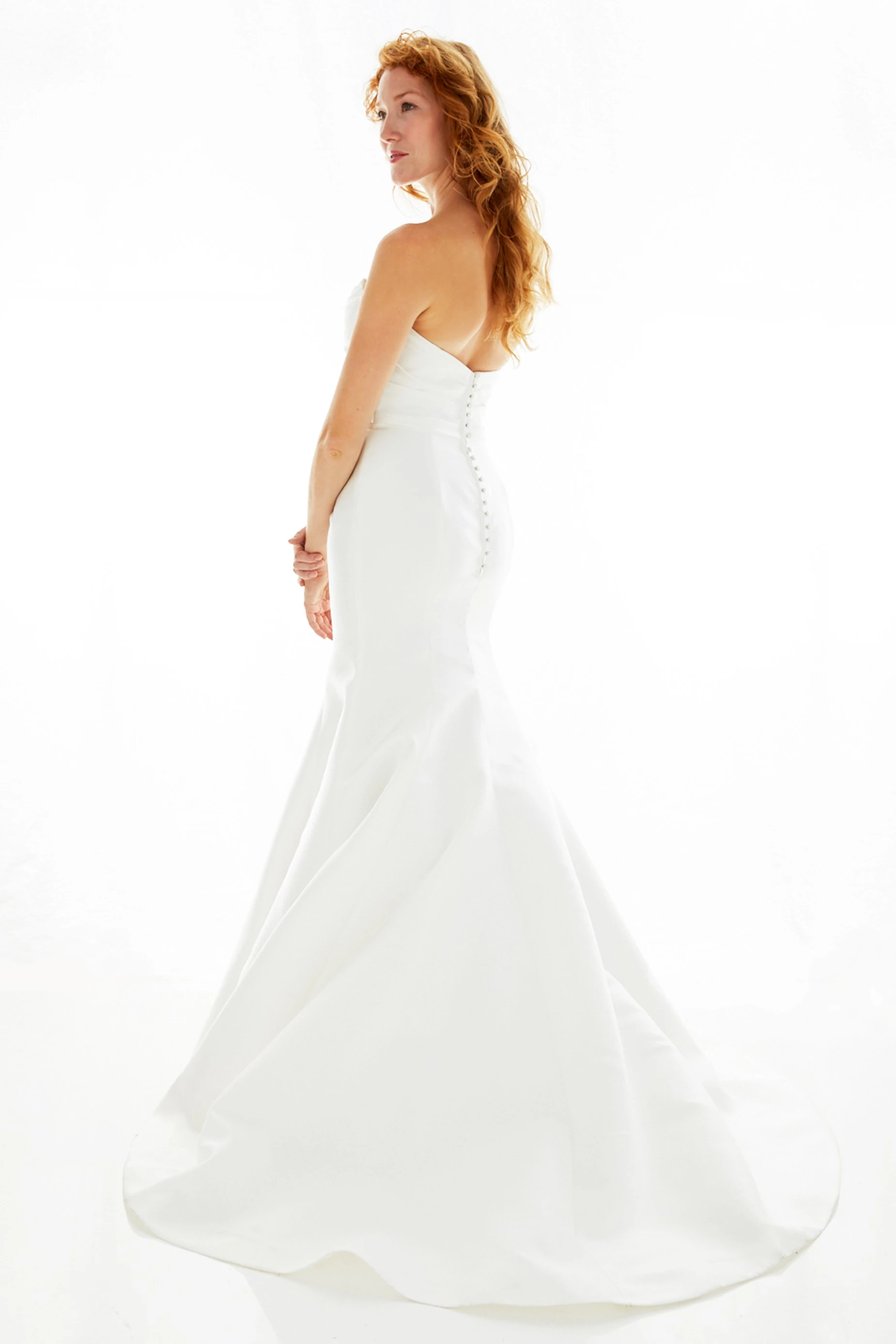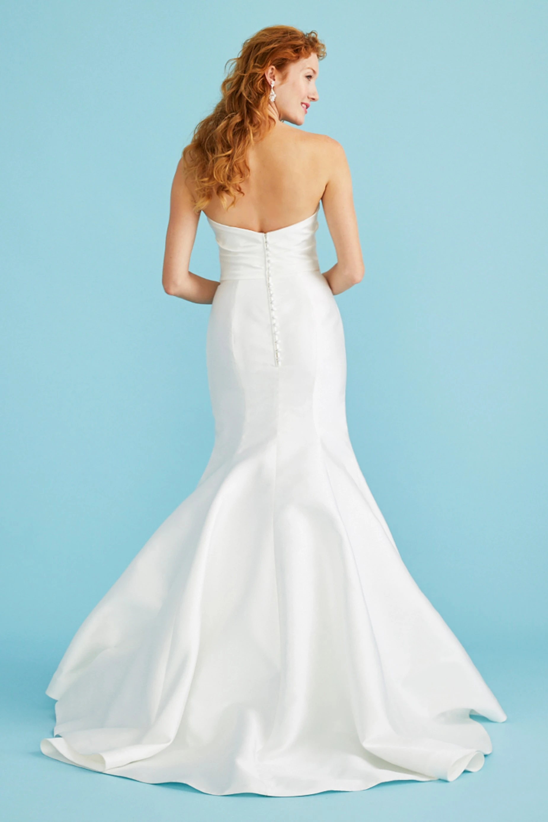 Fluted mikado gown with ruched sweetheart bodice and low back. Seams at the back skirt create a figure-hugging shape, which flows into a chapel train.Button-and-loop closure.