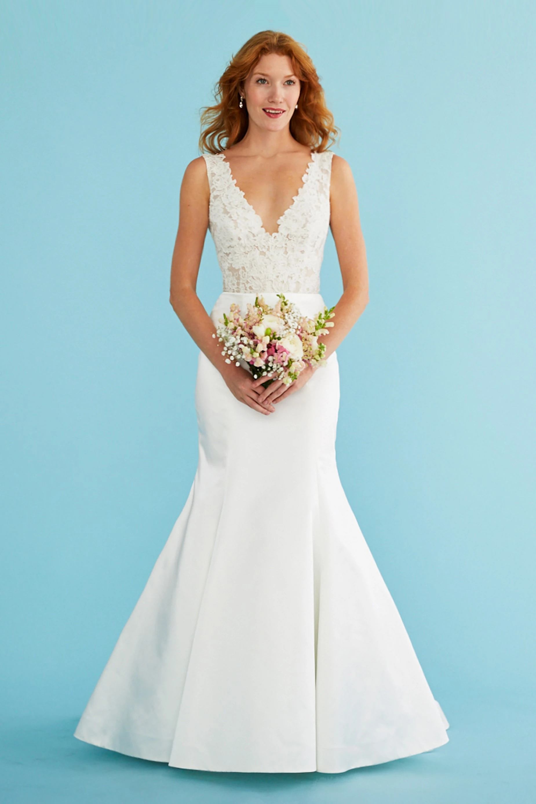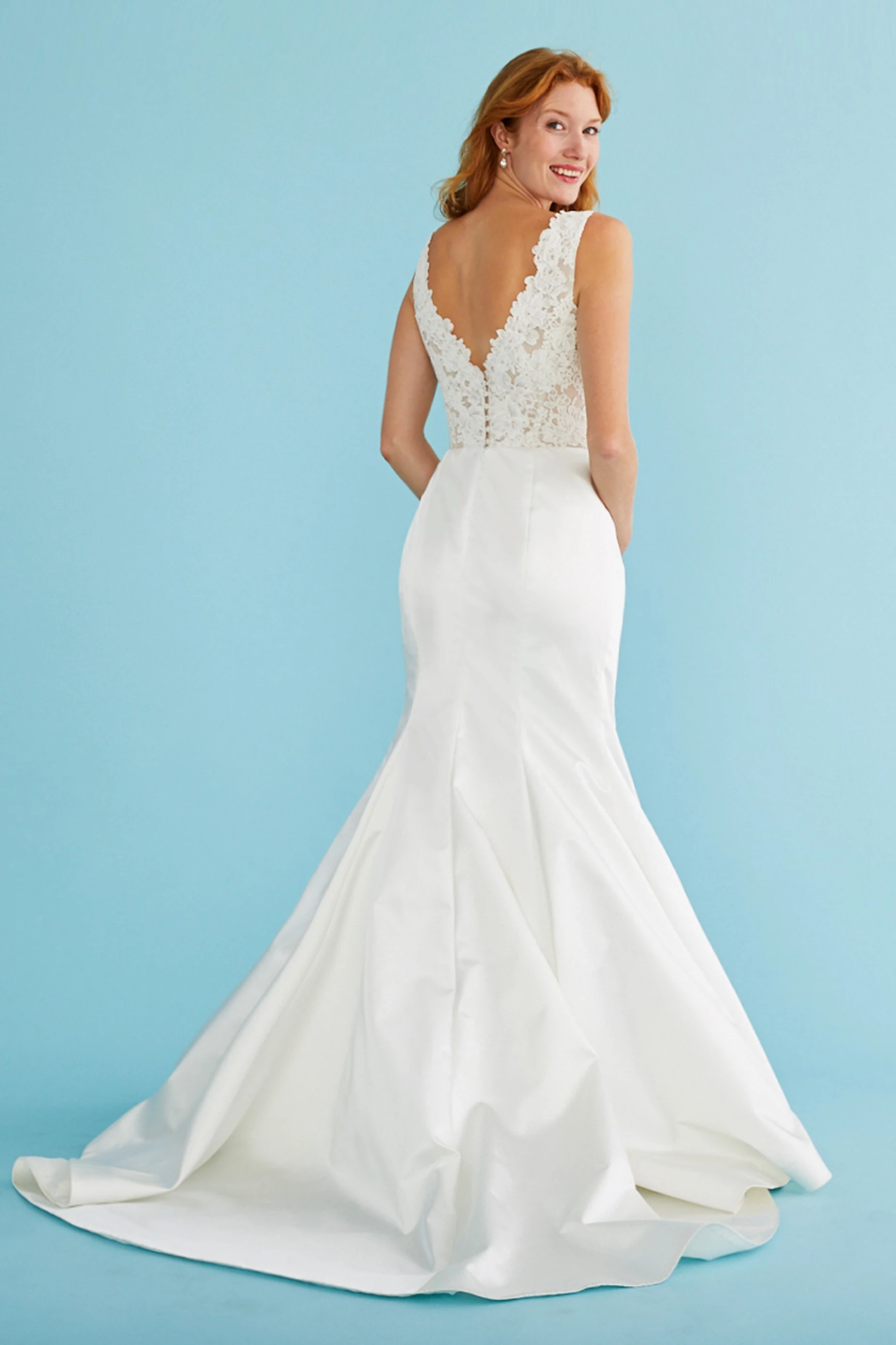 A fluted gown of duchess satin and lace. Sheer lace hugs the fitted bodice and softens the deep V-neckline and back. Architectural seams shape the fluted, duchess skirt, which spills into a voluminous chapel train. Button and loop closure.