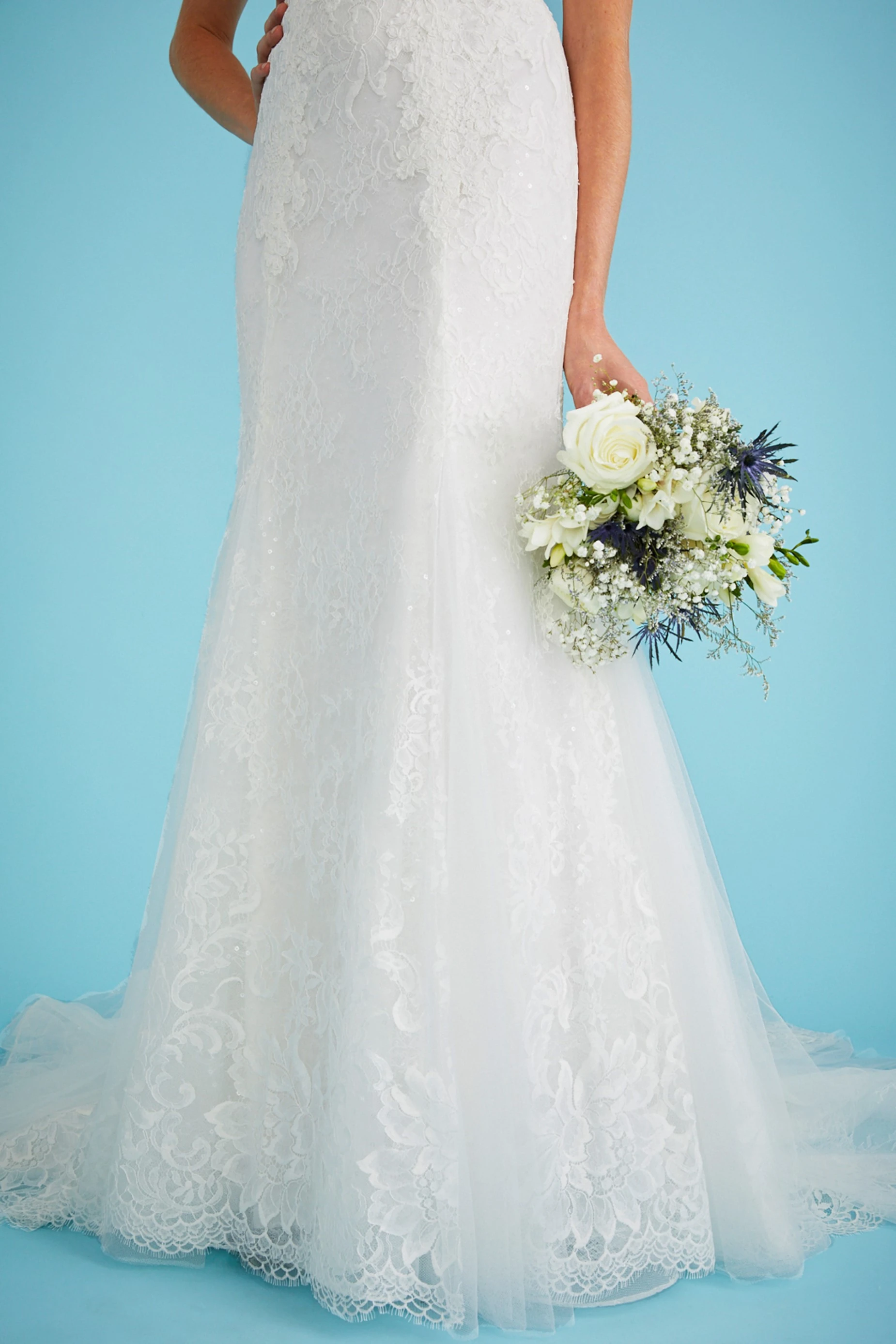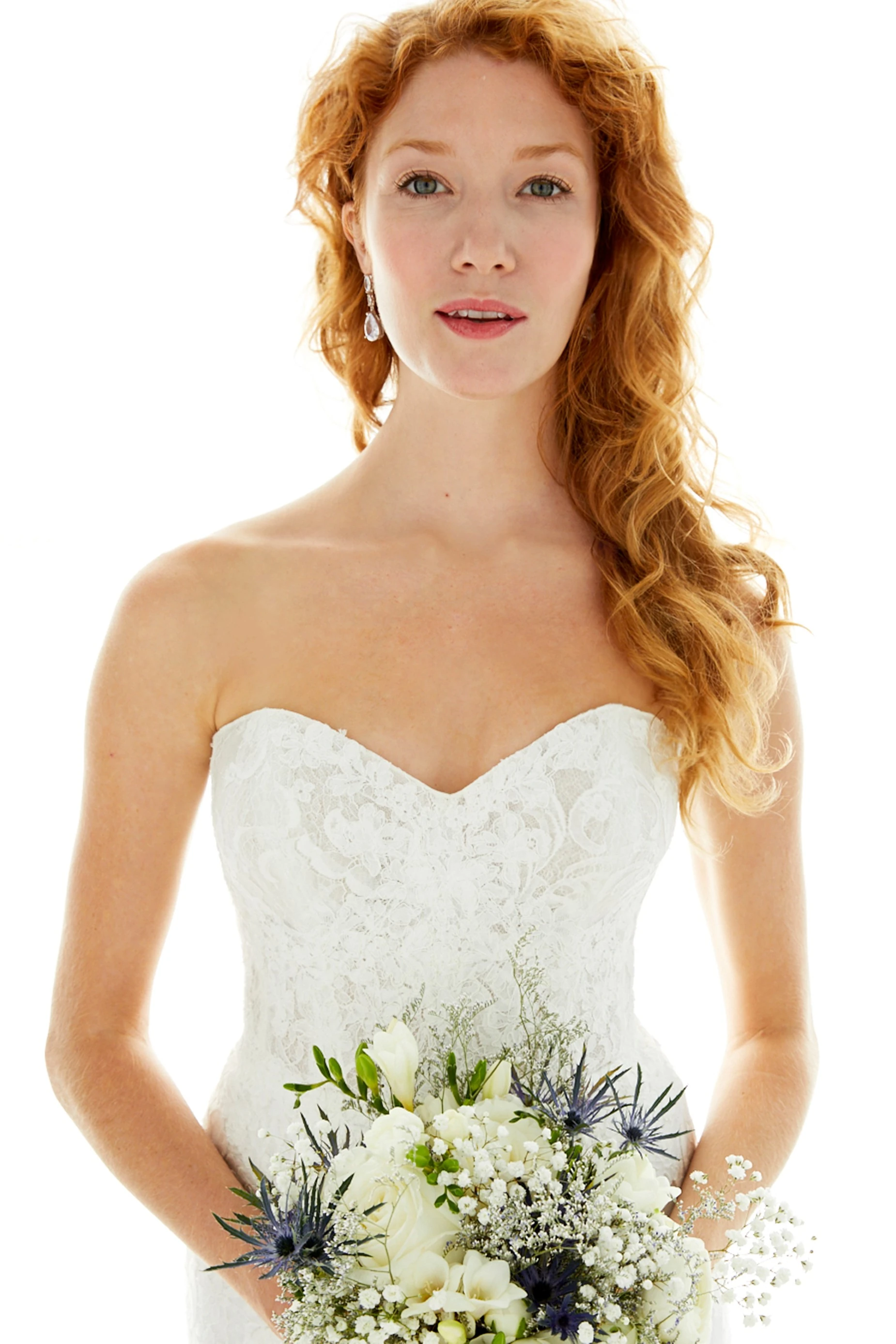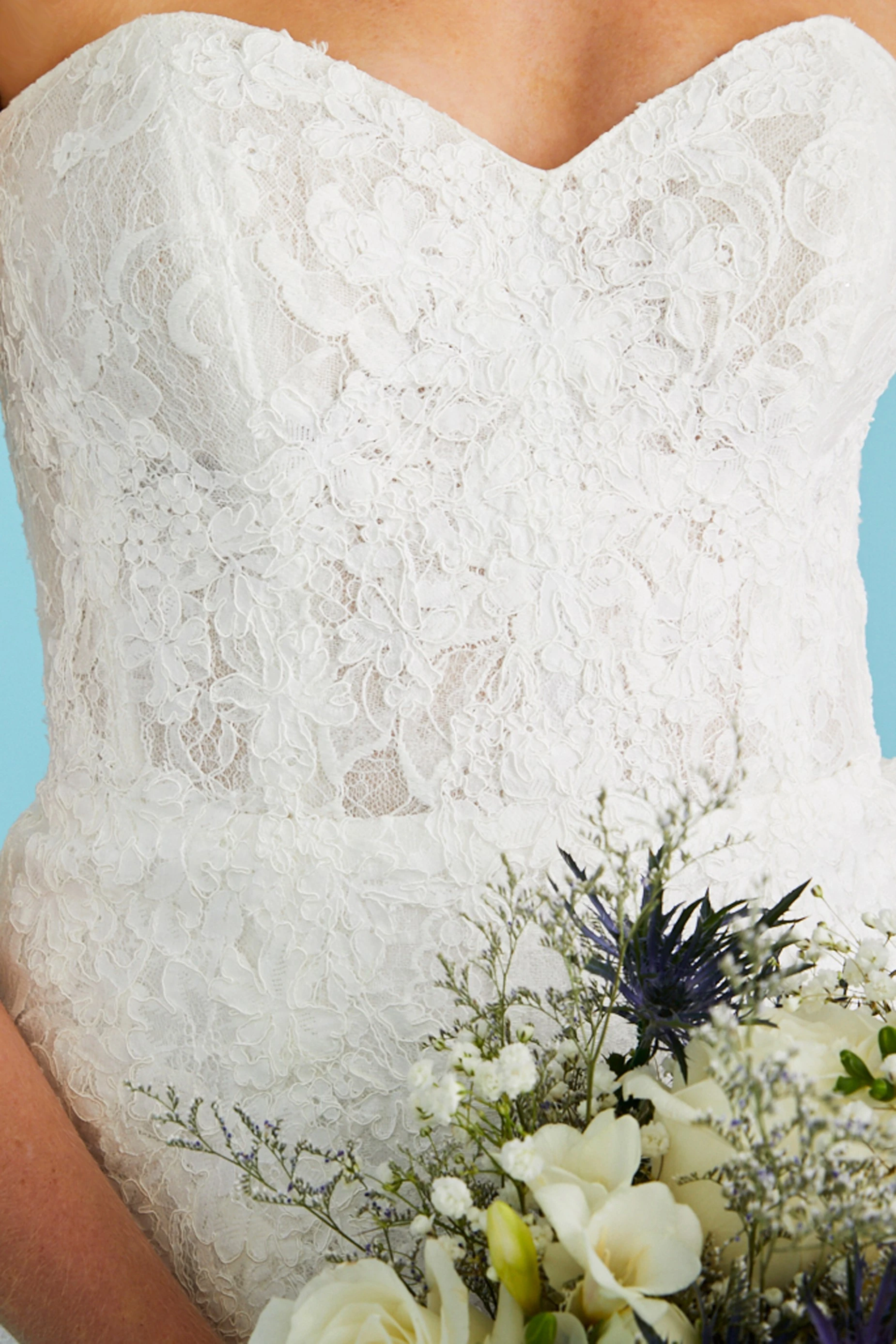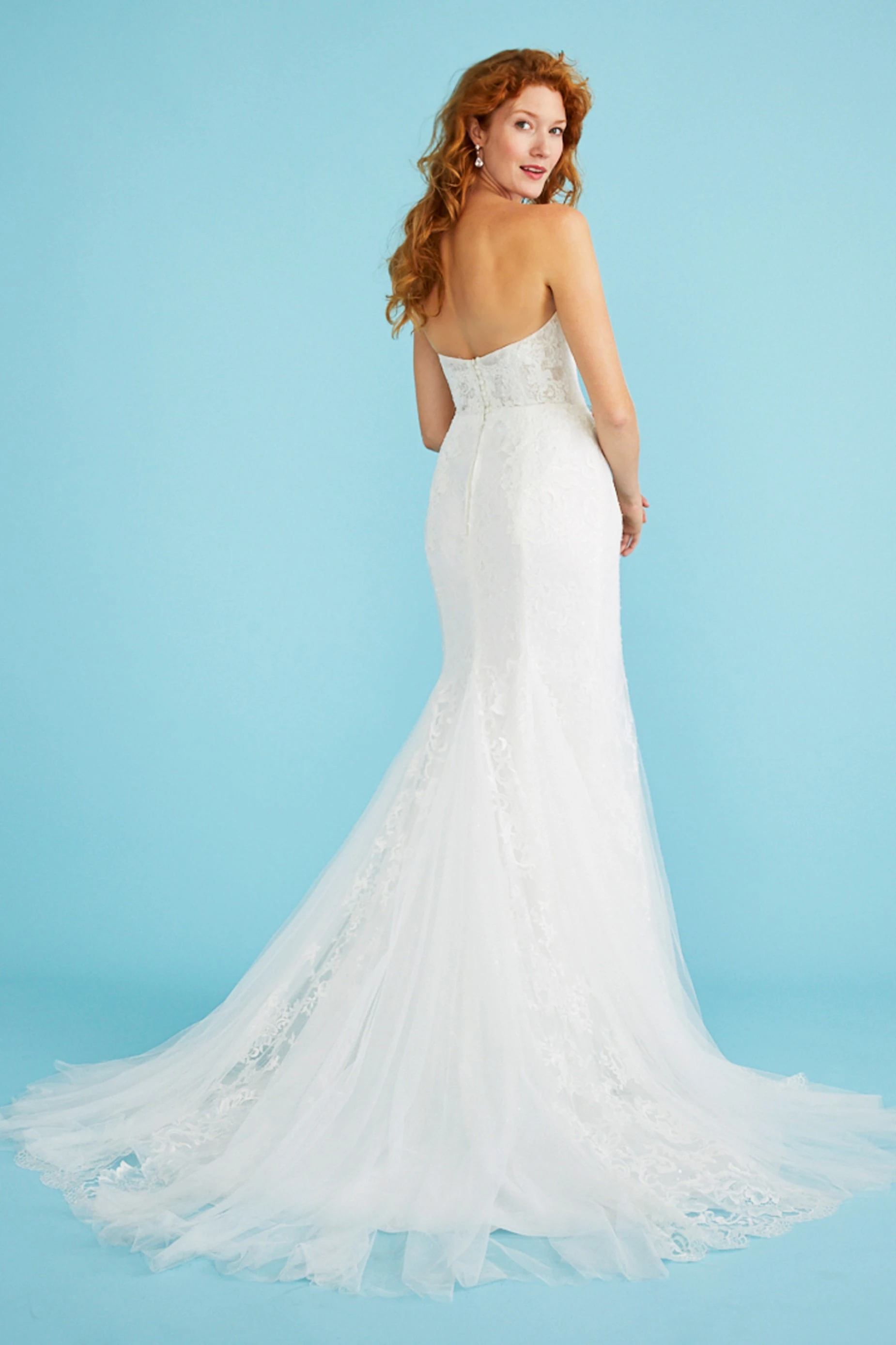 Fluted lace gown with sweetheart neckline and low back. Wrapped in sheer silk organza and lace applique, the boned, corseted bodice delivers a stunning shape. Lace and sheer, sparkly net follow the figure to fingertip. An English net overskirt flares into a gored, chapel train. Button and loop closure.