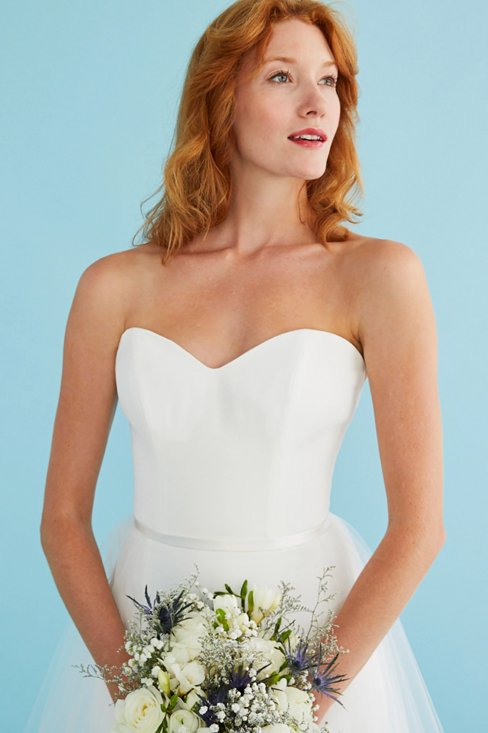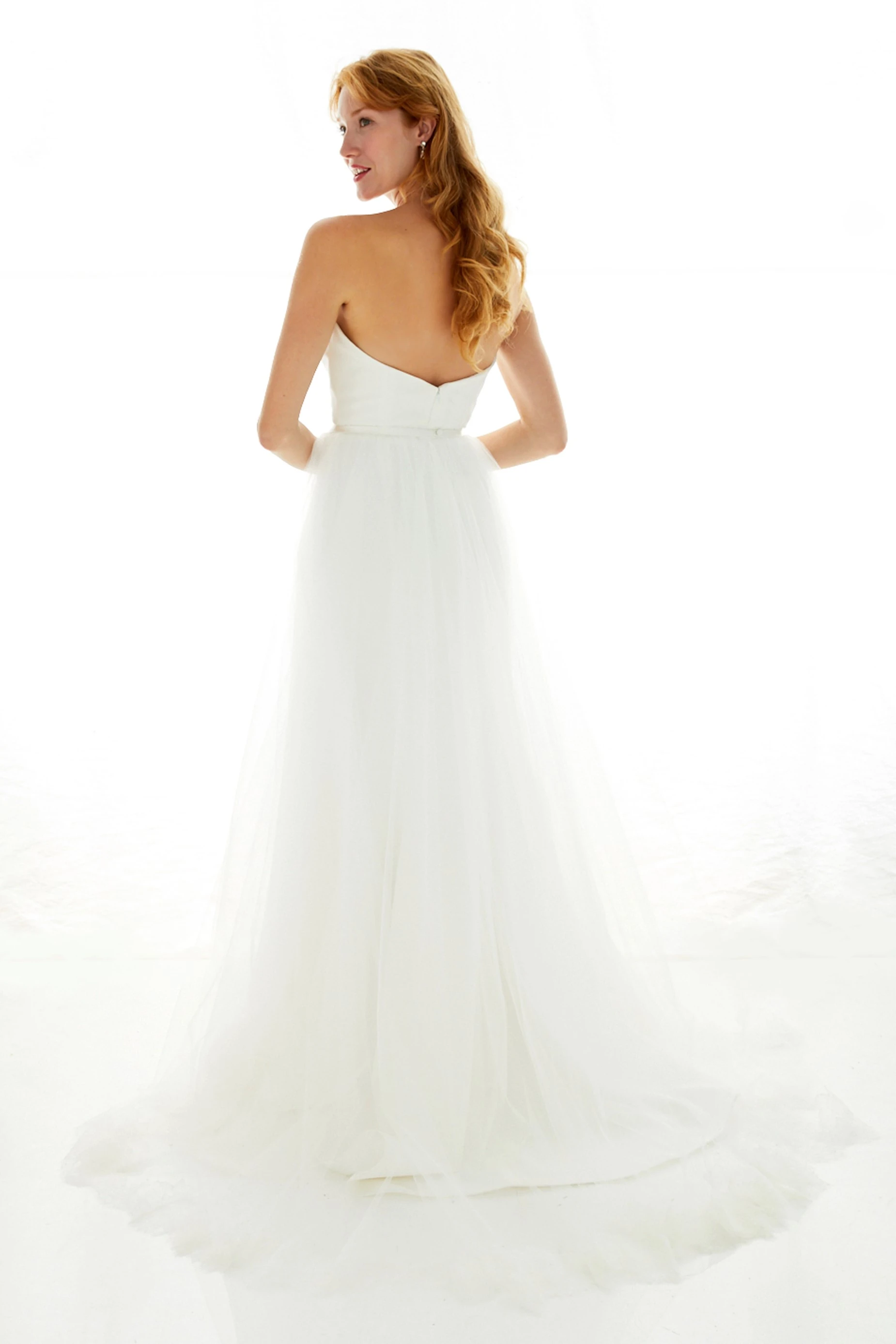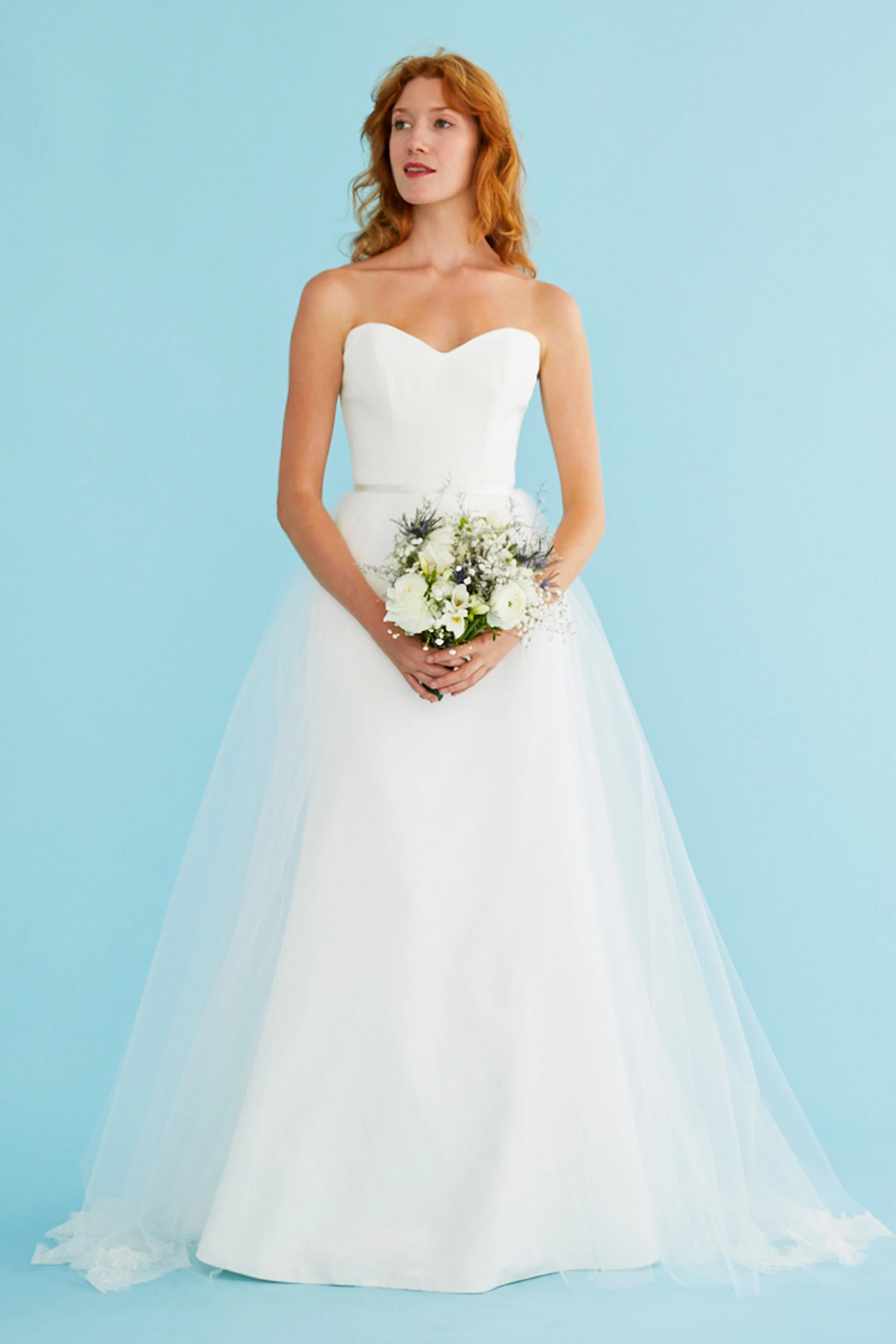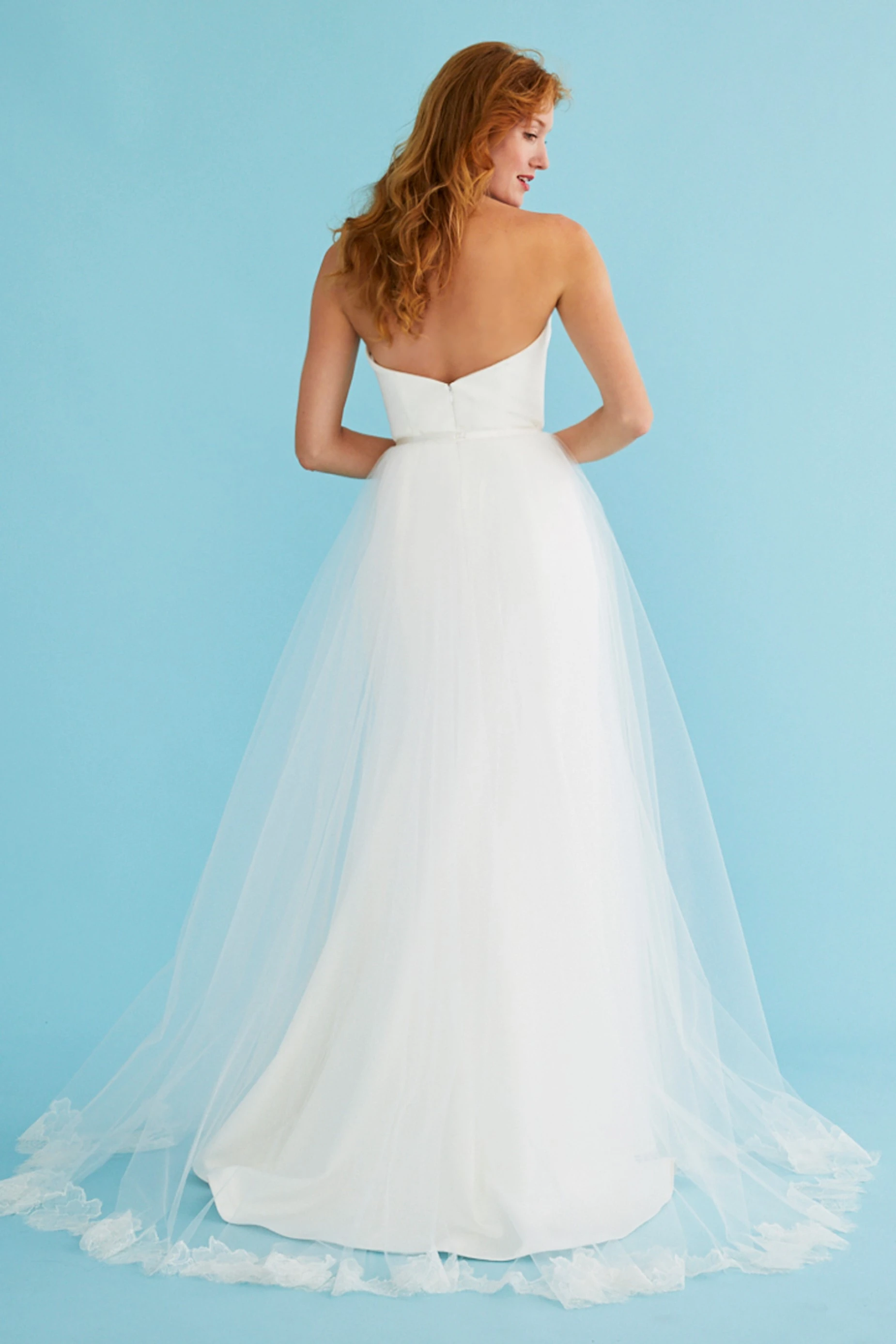Fluted gown of silk crepe. The subtle sweetheart neckline and fitted bodice transition into a sleek skirt. Affixed by a silk duchess belt, the detachable tulle overskirt (sold separately) finishes in Chantilly lace and a chapel train.